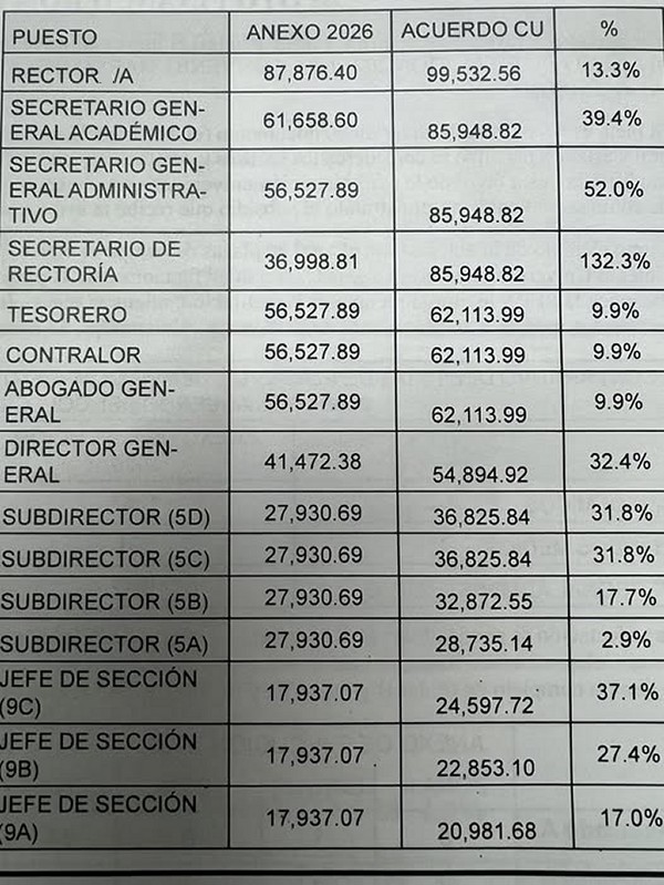 Otros cargos claves del administrativo que tuvieron aumentos significativos para este año todos rondando los 86 mil pesos como son la secretaría general académica con 39.4 por ciento; la ya mencionada secretaría de rectoría. Y la secretaría general administrativa con 52 por ciento
