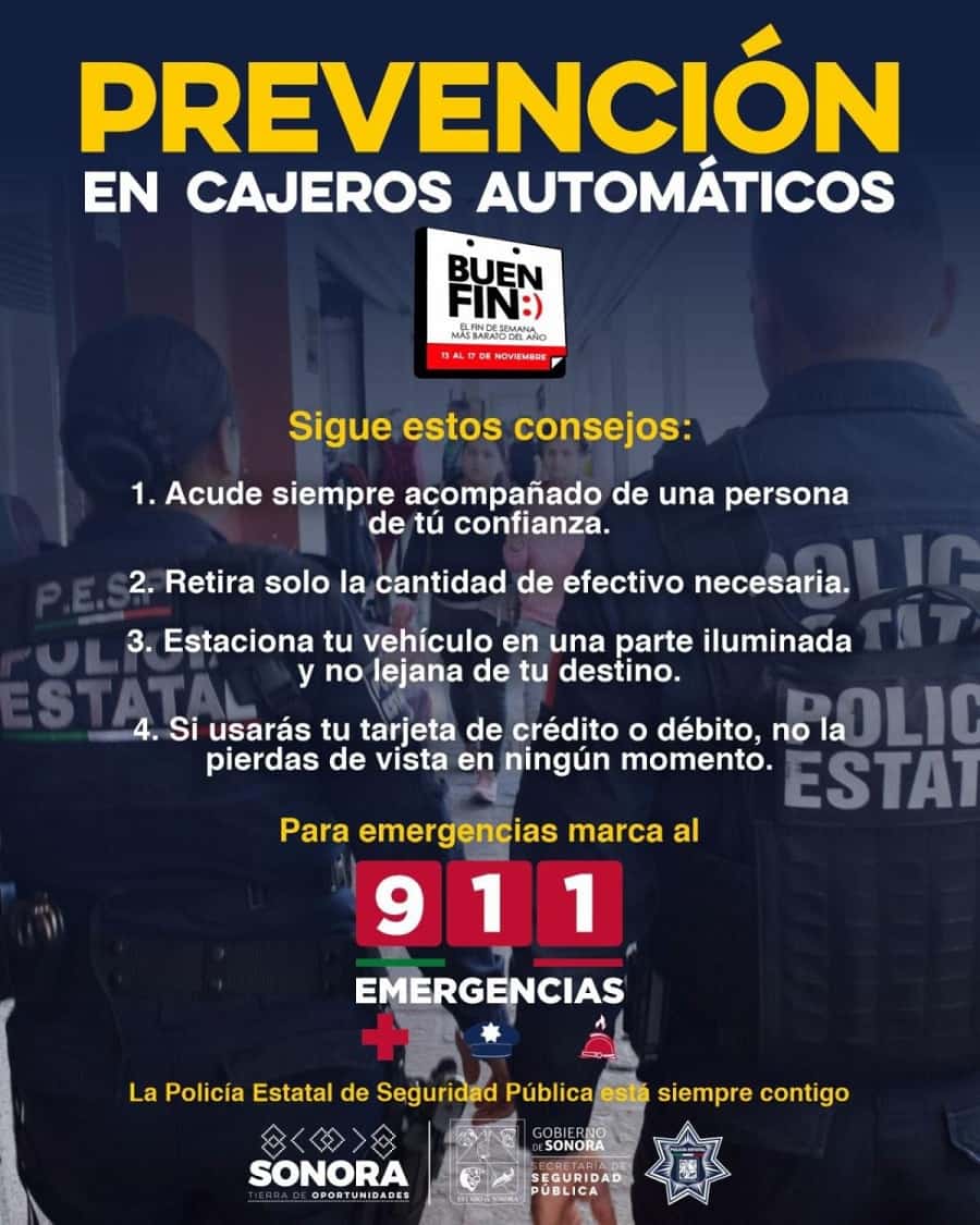 La SSP como parte su la labor preventiva, exhortó a las y los sonorenses a mantenerse alerta al momento de realizar una disposición de dinero y ante cualquier signo de alerta reportar a la línea 9-1-1.