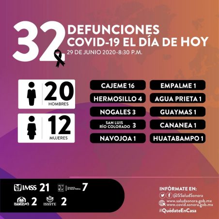 Los 32 fallecimientos ocurrieron en 20 hombres y 12 mujeres de entre 35 y 83 años de edad residentes de: Cajeme 16; Hermosillo, cuatro; San Luis Río Colorado y Nogales, tres cada uno; Agua Prieta, Guaymas, Navojoa, Empalme, Cananea y Huatabampo, uno cada uno; iniciaron síntomas entre el 30 de mayo y el 23 de junio y fallecieron entre el 12 y el 29 de junio.
