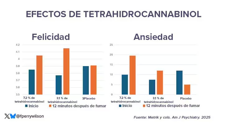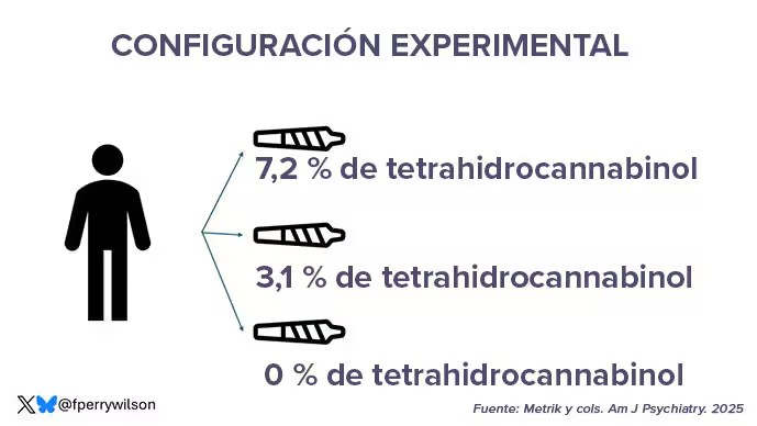 Este fue el diseño del experimento: en tres ocasiones distintas, en orden aleatorio, llevaron al participante al laboratorio y le pidieron que fumara lo que se le dijo que era un cigarrillo de marihuana. Una semana, el cigarrillo contenía 7,2 % de tetrahidrocannabinol; por cierto, eso es aproximadamente la mitad de lo que suele haber en un cigarrillo de marihuana de dispensario hoy en día), otra semana el cigarrillo tenía 3,1 % de tetrahidrocannabinol y otra semana era un cigarrillo placebo sin prácticamente nada de tetrahidrocannabinol.