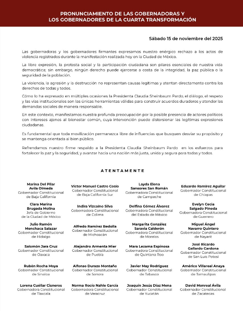 HERMOSILLO, SONORA, MX. — Vía X el gobernador de Sonora Alfonso Durazo Montaño dijo que el movimiento que representa siempre garantizará la libertad de ideas, de expresión y de manifestación. Que son, y han sido, pilares fundamentales de nuestro proyecto. Pero siempre rechazaremos la violencia en todas sus formas, especialmente cuando atenta contra la integridad física de las personas, cuando destruye y cuando divide.