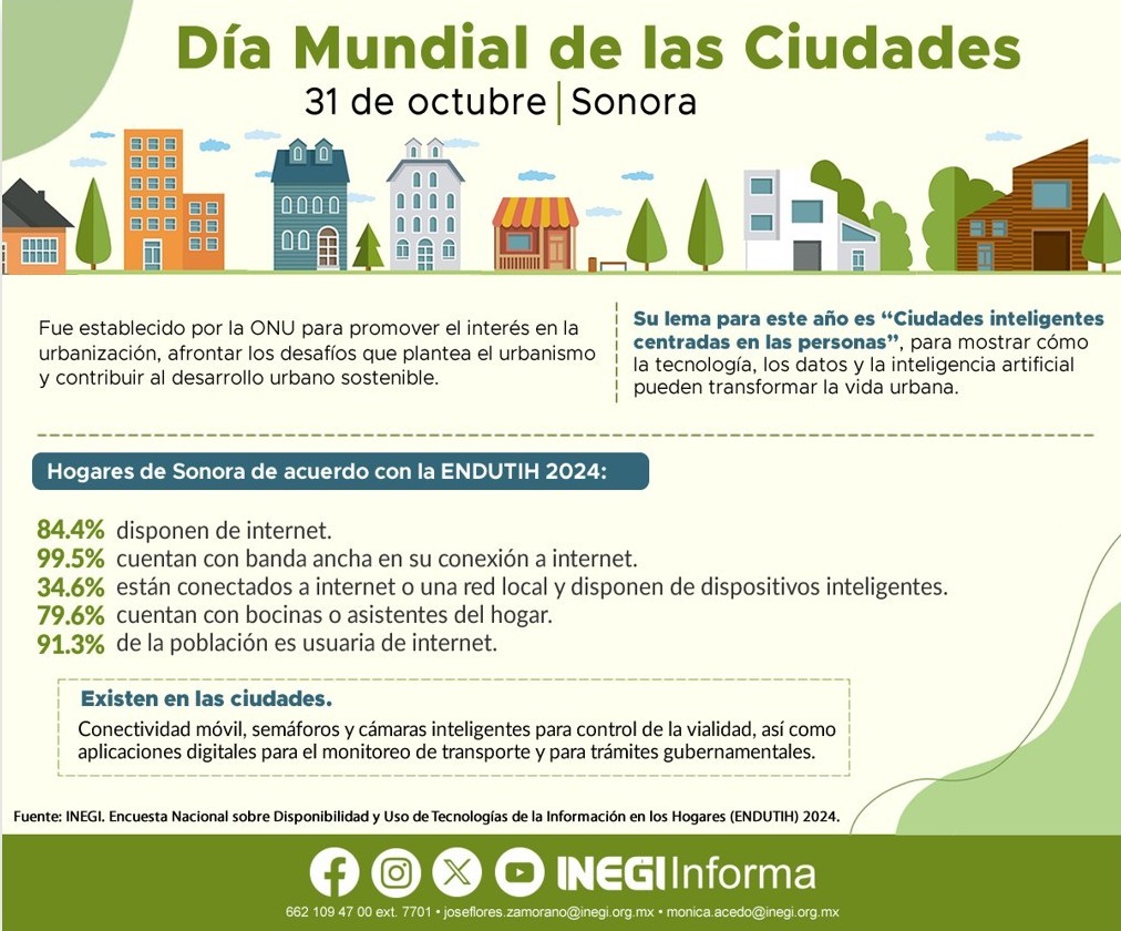 HERMOSILLO, SONORA, MX. — En el día Mundial de las ciudades, el Instituto Nacional de Estadística Geografía e Informática (Inegi) presentó estadísticas referentes a Sonora, de la (ENDUTIH) Encuesta nacional de disponibilidad y uso de tecnologías de la información en los hogares.