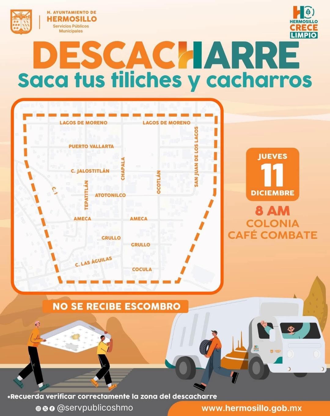 HERMOSILLO, SONORA, MX. —Como parte de las acciones que el Gobierno Municipal realiza para impedir brotes de dengue, zika y Chikungunya, así como la proliferación de fauna nociva en Hermosillo, este jueves 11 de diciembre se realizará una jornada de descacharre en la colonia Café Combate.