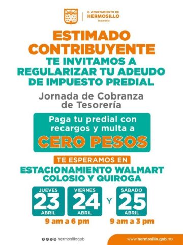 HERMOSILLO, SONORA, MX. — El estacionamiento de la tienda Walmart de Colosio y Quiroga será sede del jueves 23 al sábado 25 de abril de una jornada en la que ciudadanas y ciudadanos con adeudos pendientes por concepto de predial podrán ponerse al corriente con recargos y multas a cero pesos.