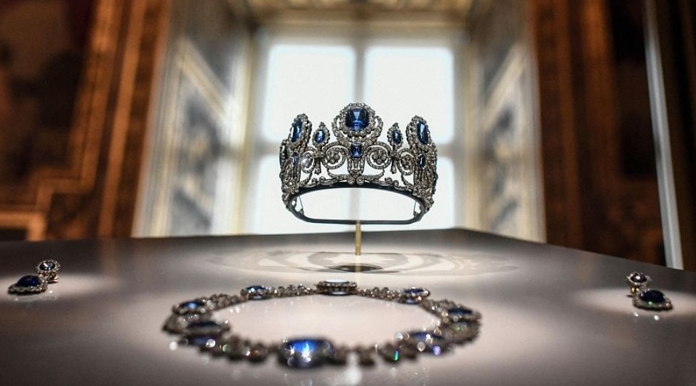 Entre las joyas que la banda organizada consiguió sustraer de la Galería de Apolo, tras romper una ventana, destaca un conjunto de una diadema, un collar y unos pendientes de zafiros de Ceilán, nombre antiguo de Sri Lanka.