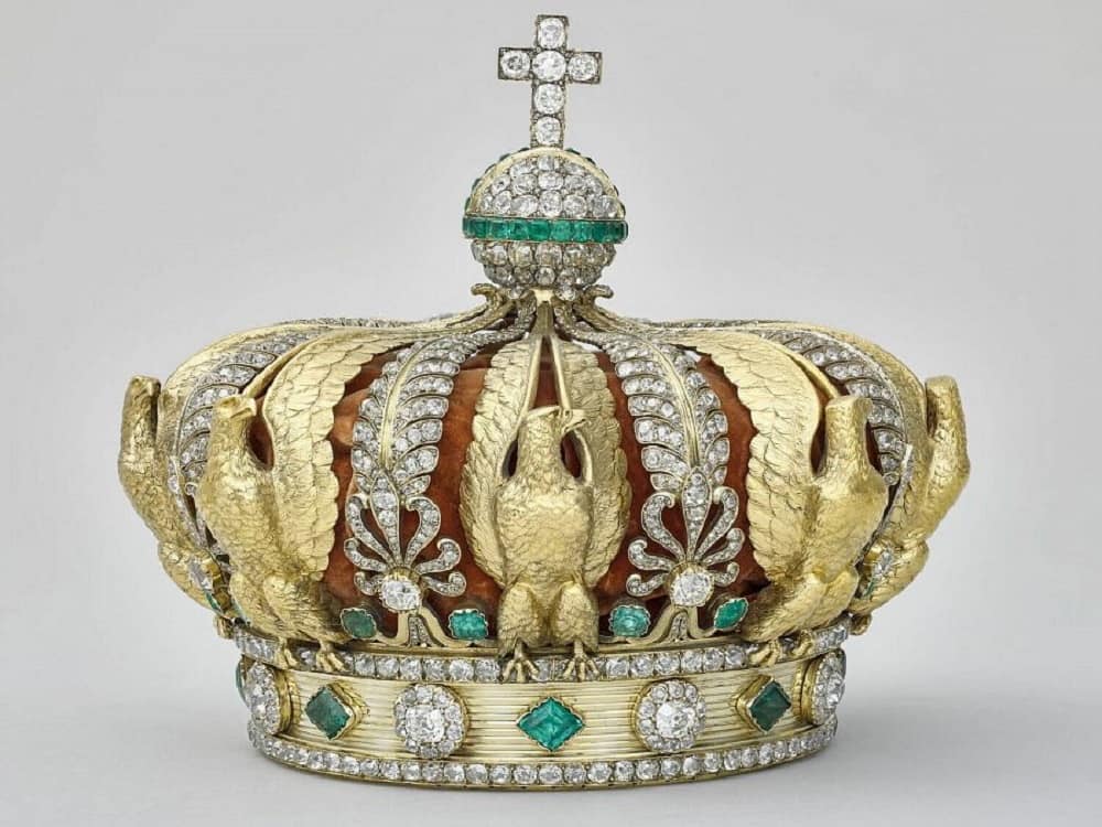 Detalla que la corona se realizó en 1855, con la colaboración de dos firmas de joyería Lemonnier y Maheu, una pieza que incluye oro, diamantes y esmeraldas.
