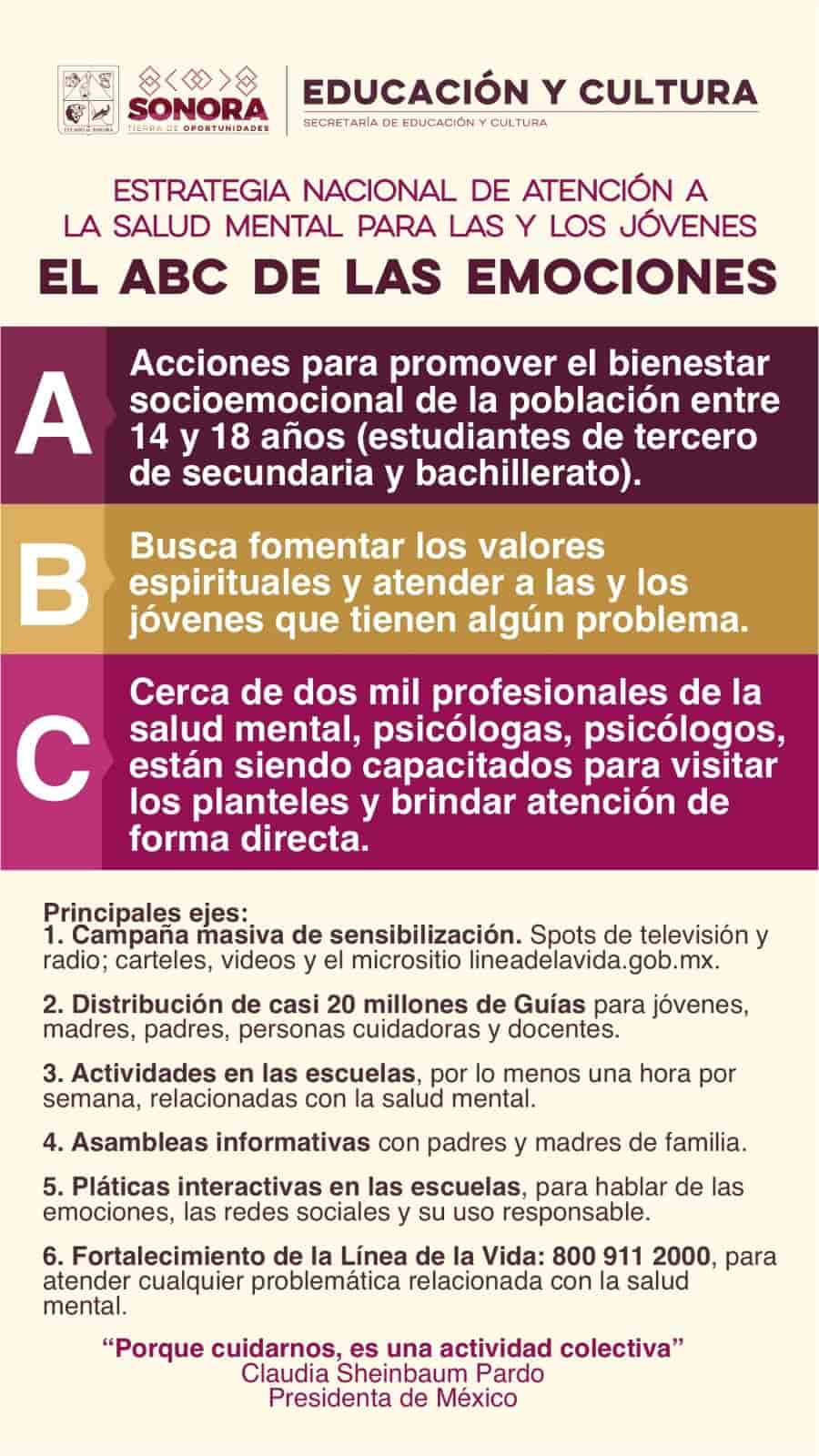 Por otra parte, mencionó la importancia de iniciativas como la Estrategia Nacional de Atención a la Salud Mental para las y los Jóvenes. El ABC de las Emociones, anunciado por la presidenta de México, Claudia Sheinbaum, misma que contará con todo el respaldo del gobernador Alfonso Durazo.