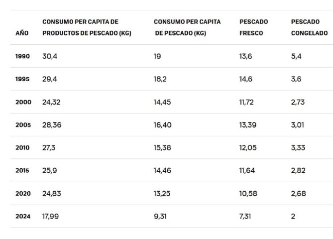 Quizás no parezcan grandes descensos, pero la crisis que afronta el pescado se entiende mejor cuando se amplía el foco temporal y analizan los datos de consumo per cápita. En ese caso se constata un desplome que ha golpeado de lleno al sector. La propia Fedepesca advierte que en los últimos años «el comercio de proximidad en general y las pescaderías en particular han perdido un tercio de sus tiendas».