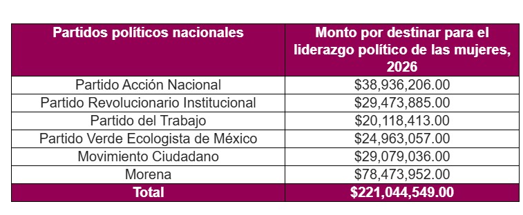 CIUDAD DE MÉXICO. ̶ ̶ De acuerdo con el financiamiento público aprobado por el Instituto Nacional Electoral (INE) para el ejercicio 2026, los seis partidos políticos nacionales deberán destinar, como mínimo, 221 millones 44 mil 549 pesos (mdp) para la capacitación, promoción y el desarrollo del liderazgo político de las mujeres.