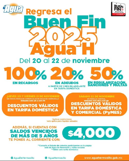 HERMOSILLO, SONORA, MX. —Como parte de las promociones que Agua de Hermosillo ofrece para usuarias y usuarios que deseen ponerse al corriente, el organismo operador anunció el regreso del Buen Fin del 20 al 22 de noviembre con atractivos descuentos.