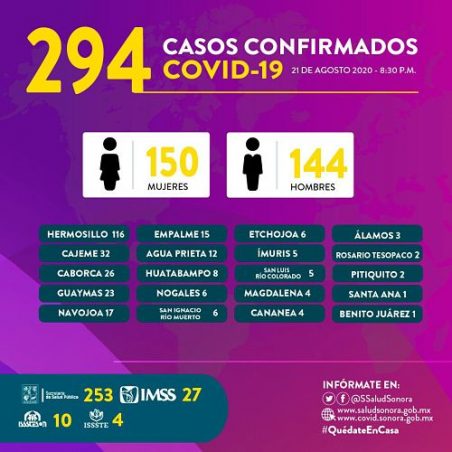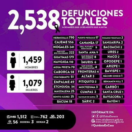 HERMOSILLO, SONORA. MX. — Este viernes (21.08.2020) se confirmaron 24 defunciones y 294 nuevos casos de coronavirus en Sonora, de acuerdo con información de la Secretaría de Salud en el estado.