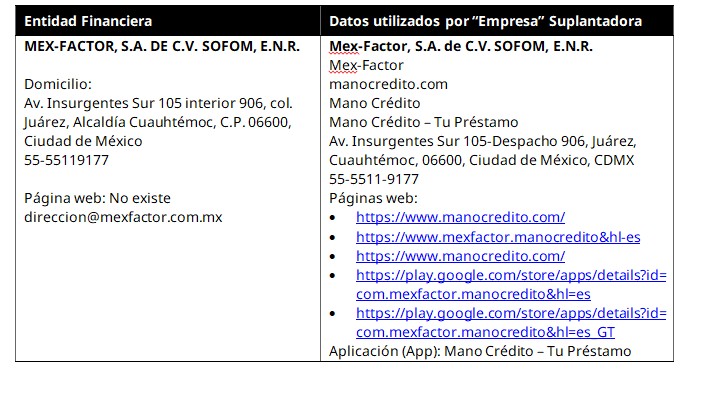 CIUDAD DE MÉXICO. ̶ ̶ La Comisión Nacional para la Protección y Defensa de los Usuarios de Servicios Financieros (CONDUSEF) alerta a la población en general sobre la suplantación de identidad que afecta a la institución financiera MEX-FACTOR, S.A. DE C.V. SOFOM E.N.R., mediante el uso indebido de su nombre, teléfono y domicilio a través de páginas de internet y una aplicación móvil, en las que se ofrecen supuestos servicios de otorgamiento de crédito con la finalidad de engañar o afectar económicamente a las personas usuarias.